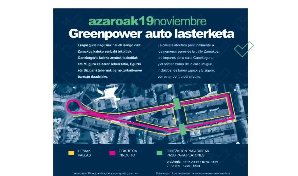 El circuito será circular, desde la calle Urki hasta la rotonda que conduce a la autopista, por lo que permanecerá cerrado al tráfico rodado. También afectará a peatones. Los números pares de la calle Zamakoa, los números impares de la calle Ganekogorta y el primer tramo de la calle Muguru quedarán dentro del circuito, por lo que esta zona permanecerá totalmente cerrada entre las 09:45 y las 13:00 horas, y sólo se permitirá