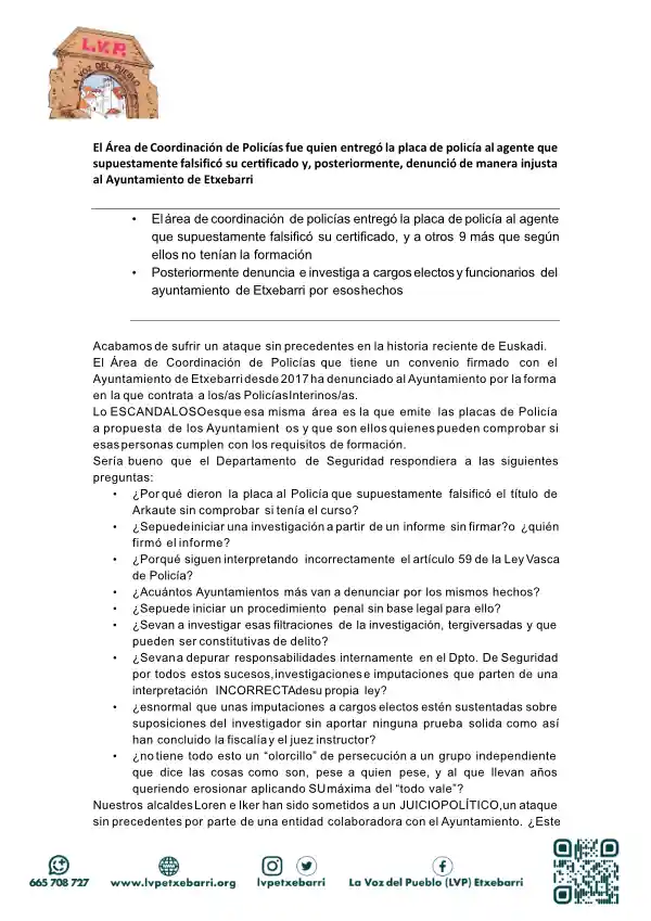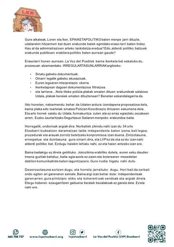 La Voz del Pueblo (LVP), grupo independiente que gobierna Etxebarri desde hace más de 30 años, ha emitido un duro comunicado en el que expresa sus sospechas de que la denuncia presentada por el Departamento de Seguridad contra sus representantes en el Ayuntamiento destila “un olorcillo a persecución a un grupo independiente que dice las cosas como son, pese a quien pese, y al que llevan años queriendo erosionar aplicando SU máxima del todo vale”.