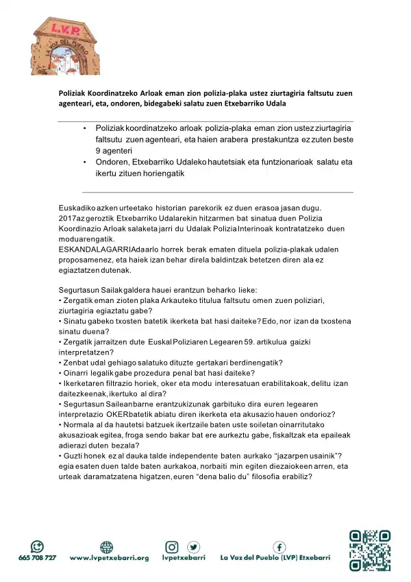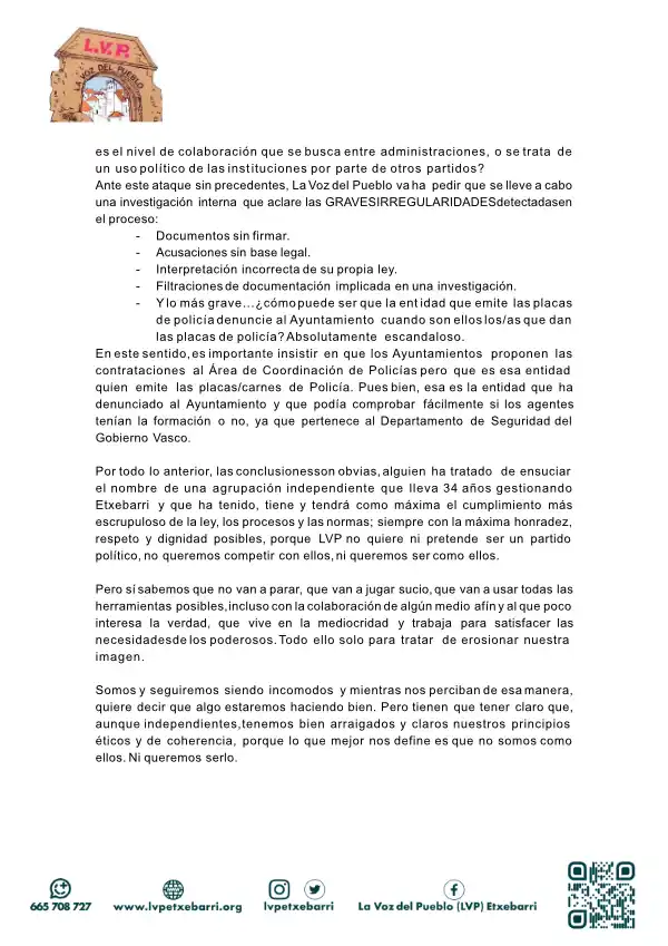 Esta acusación se centra en el hecho de que la misma institución que interpuso la denuncia, el Departamento de Seguridad, es la que “emite las placas de Policía a propuesta de los Ayuntamientos y que son ellos quienes pueden comprobar si esas personas cumplen con los requisitos de formación”. Así que para LVP han existido numerosas irregularidades que quiere aclarar con una investigación, porque considera que “alguien ha tratado de ensuciar el nombre de la agrupación independiente”.