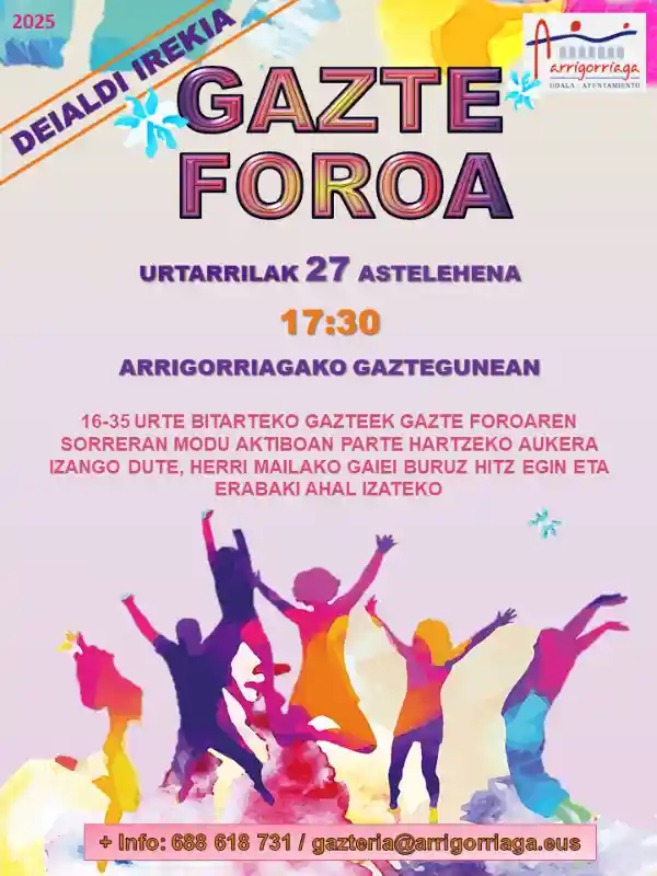 Desde el consistorio arrigorriagarra se anima a la juventud de la localidad a unirse a este foro asistiendo a la primera reunión que tendrá lugar a las 17:30 en el Gaztegune de Arrigorriaga, como hemos mencionado, este próximo lunes 27 de enero. Podrán participar jóvenes de entre 16 y 35 años tanto del casco urbano como de Abusu. Para más información, los y las jóvenes pueden llamar al 688 618 731 o escribir a gazteria@arrigorriaga.eus.