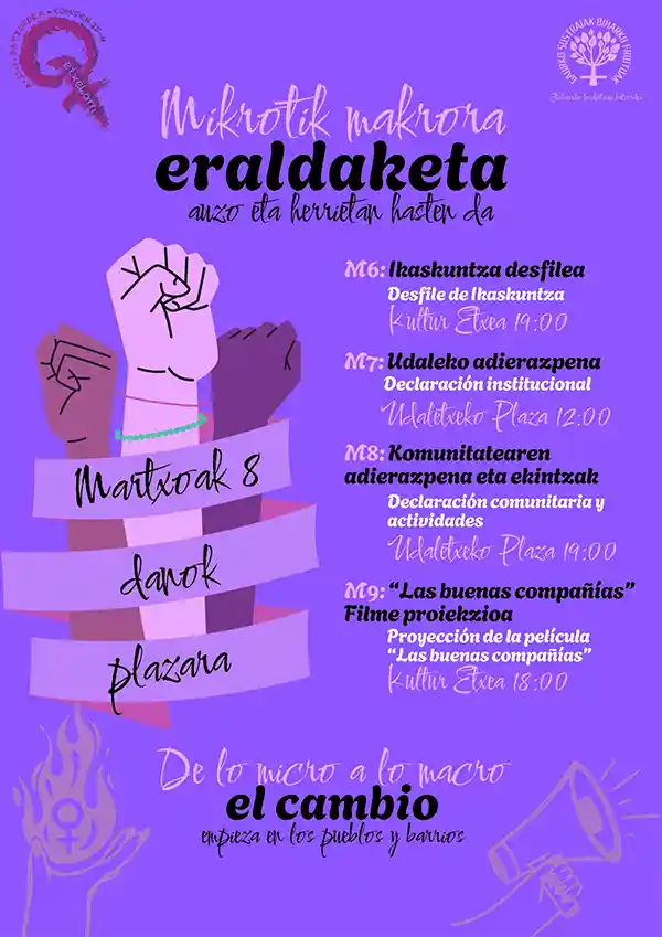 El programa, que tiene como lema «De lo macro a lo micro, el cambio comienza en los pueblos y barrios«, arrancará el jueves día 6 con la celebración de la convocatoria mensual del Club de Lectura Feminista de la mano de Josune Muñoz en el Salón de Plenos del Ayuntamiento (17:00 horas), para, posteriormente, de la mano de la asociación de costura y bordado Ikaskuntza, asistir a un desfile de moda en la Casa de Cultura (19:00 horas).