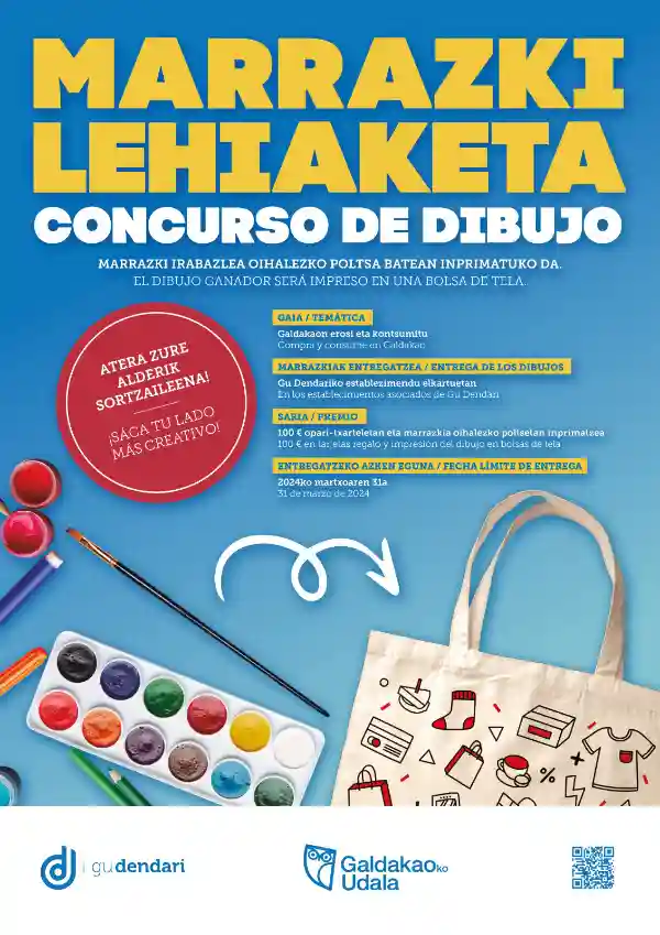 Con el tema “Compra y consume en Galdakao”, Gu Dendari quiere involucrar y animar a los y las “artistas” de Galdakao a participar en el diseño que lucirán estas bolsas reutilizables, Además la persona ganadora recibirá un premio de 100 euros en tarjetas regalo. Los dibujos se podrán entregar hasta el 31 de marzo en cualquiera de los establecimientos asociados a Gu Dendari, cuyo listado se puede consultar aquí.