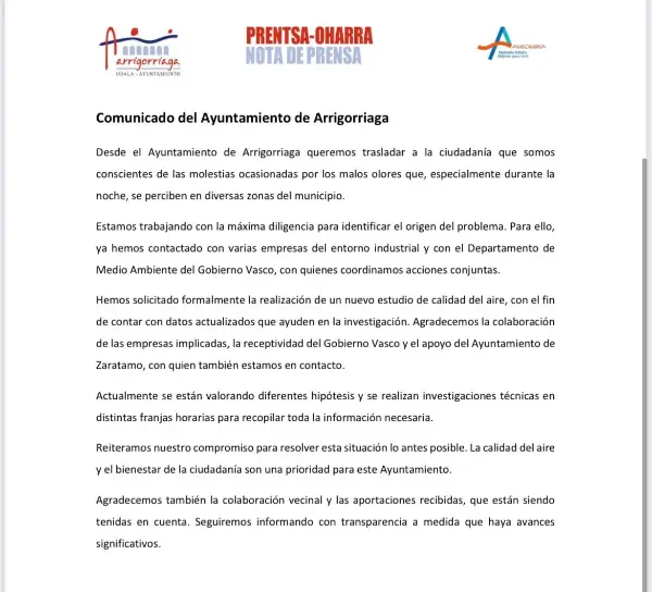 Arrigorriaga viene soportando desde hace un tiempo molestos olores en algunas zonas del municipio, olores que se acentúan por la noche. Ante esta situación, el Ayuntamiento ha comenzado a investigar el origen de estos malos olores en colaboración con el Gobierno vasco, empresas de alrededor y el Ayuntamiento de Zaratamo.
