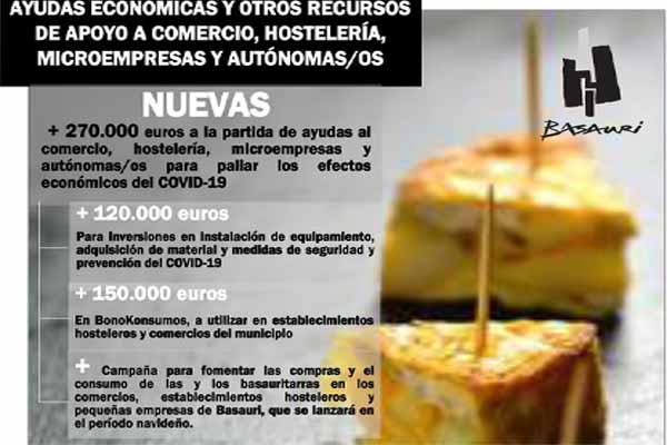 El ayuntamiento de Basauri va a alcanzar la cifra de casi el millón de euros invertidos en ayudas económicamente a los comercios, establecimientos hosteleros, personas autónomas y empresas de menos de 50 trabajadores, con la ampliación de 270.000€ que acaba de aprobar. Esta partida irá destinada en parte ( 120.000 €) a ayudas directas, y 150.000 € se destinarán a BonoKonsumos, que podrán gastarse en lo establecimientos comerciales y hosteleros del municipio coincidiendo con la época de rebajas de Enero.