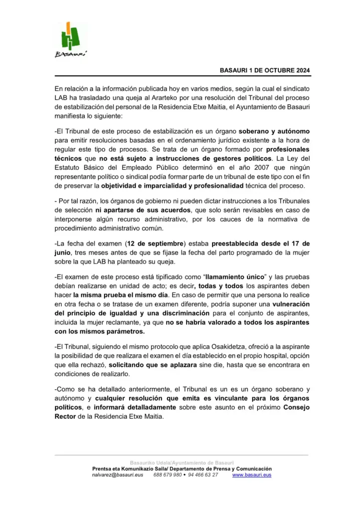 El Ayuntamiento de Basauri ha emitido un comunicado en el que quiere aclarar algunos aspectos sobre una noticia aparecida en varios medios en el día de hoy. La noticia recogía la queja al Arateko por parte del Sindicato LAB referida al Tribunal del proceso de estabilización del personal de la residencia municipal Etxe Maitia de la localidad, al que acusaba de «discriminación directa» porque una trabajadora eventual no pudo realizar el examen para obtener la plaza fija de auxiliar de enfermería por coincidir esta prueba el mismo día del su parto y no ofrecerle este Tribunal una fecha alternativa.