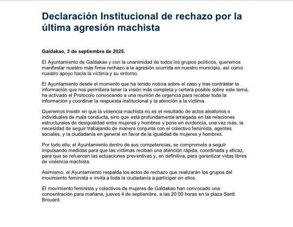 Además de la condena a la agresión, la declaración recoge el compromiso del Ayuntamiento para seguir trabajando por la igualdad entre hombres y mujeres y respalda la concentración que han organizado el movimiento feminista y colectivos de mujeres de Galdakao para mañana, jueves 4 de septiembre, a las 20:00 horas en la plaza Santi Brouard.