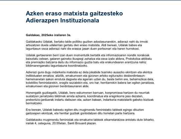 El Ayuntamiento de Galdakao aprueba una Declaración Institucional de rechazo a la agresión machista ocurrida este fin de semana