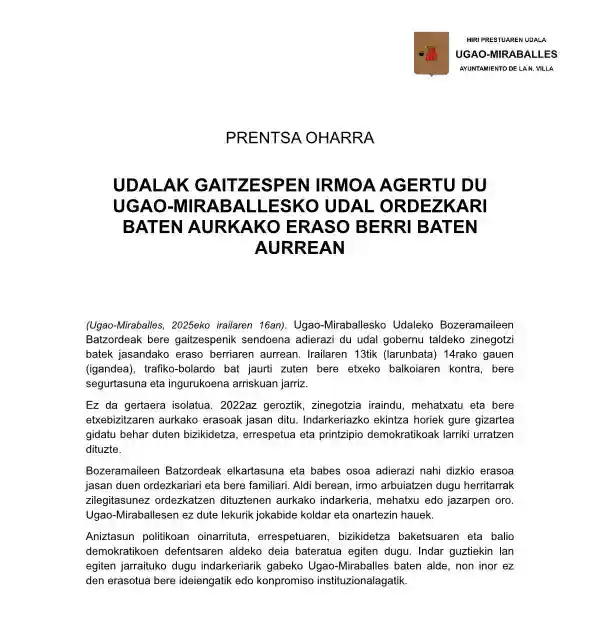 En el texto se recoge el tajante rechazo por parte de los grupos políticos del Consistorio ugaotarra a esta agresión violenta , “desde la pluralidad política, hacemos un llamamiento unánime a favor del respeto, la convivencia pacífica y la defensa de los valores democráticos. Seguiremos trabajando con firmeza por un Ugao-Miraballes libre de violencia, donde nadie sea atacado por sus ideas ni por su compromiso institucional”.