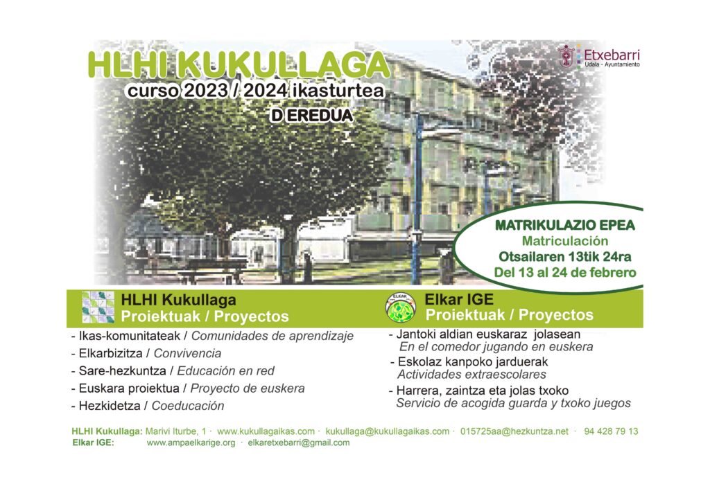 Este ejemplar se entregará a las familias en el Centro Educativo Kukullaga, al formalizar la prematrícula y en el SAC del Ayuntamiento de Etxebarri, en el resto de los casos.