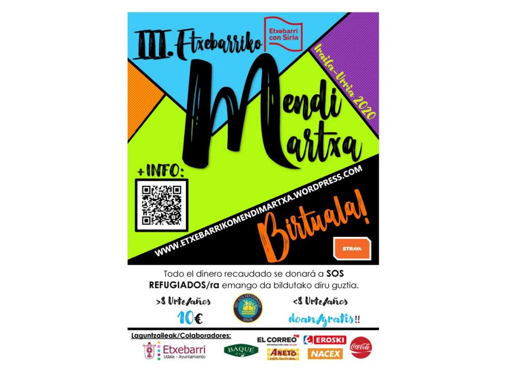 La tercera edición de la Mendi Martxa, organizada por la asociación de cooperación Etxebarri con Siria, y con el apoyo del ayuntamiento de Etxebarri, varía su formato tradicional debido al virus COVID 19 y se realizará el día que cada participante decida, de manera individual o en pequeños grupos, siguiendo el recorrido propuesto mediante la utilización de una aplicación de móvil (Strava, Wikiloc…) La prueba se podrá realizar desde el 19 de septiembre hasta el 31 de octubre, para que las personas asistentes tengan libertad a la hora de realizarla y evitar de esta forma masificaciones.