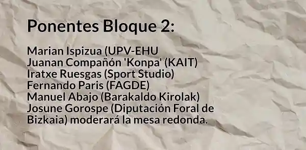 El municpio de Bsauri cobrará protagonismo al explicar el caminoq ue le ha llevado a conseguir ser Ciudad Europea del Deporte 2024 y el legado que supondrá para sus vecinas y vecinos. Una ponencia de Luis Solar (OTSp) dará paso a una mesa redonda con la participación de responsables deportivos de diferentes entidades: Carlos Sergio (Diputación Foral de Bizkaia), Jon Zugazagoitia (Ayuntamiento de Basauri), Itziar Carroceras (Ayuntamiento de Santurtzi) y Jon Iraola (Ayuntamiento de Eibar). La ponencia de cierre correrá a cargo de Raúl Martínez de Santos (UPV-EHU) y resumirá las principales claves con una visión crítica y constructiva.
