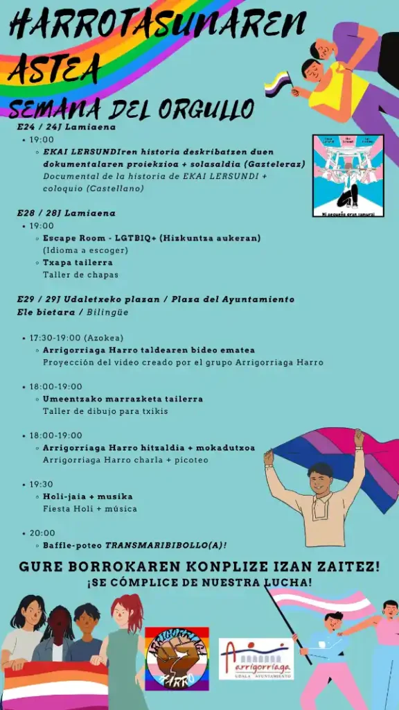 Del 24 al 29 de junio Arrigorriaga celebrará la Semana del Orgullo con motivo de la celebración del Día Internacional del Orgullo que tendrá lugar el 28 de junio. El Ayuntamiento de Arrigorriaga, en colaboración con el colectivo LGTBIQ+, Arrigorriaga Harro, han organizado un programa de actividades con el objetivo de mostrar el orgullo por la diversidad del municipio.