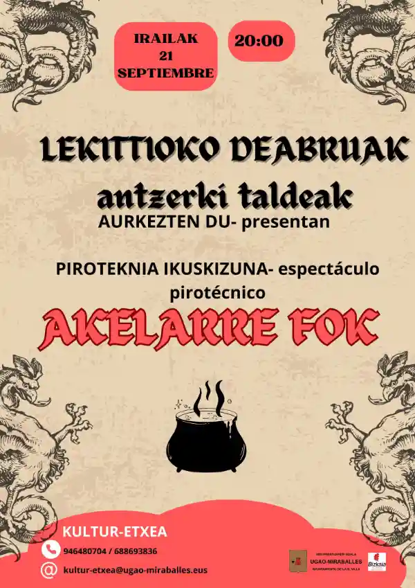 Lekittoko Deabruak, grupo de teatro de Lekeitio, presenta este sábado 21 de septiembre a partir de las 20:00 horas en la fuente de los Tres Caños de Ugao-Miraballes su espectáculo pirotécnico “Akelarre Fok», inspirado en los correfoc del Mediterráneo e reinterpretándolos bajo el prisma de las tradiciones de Euskal Herria.