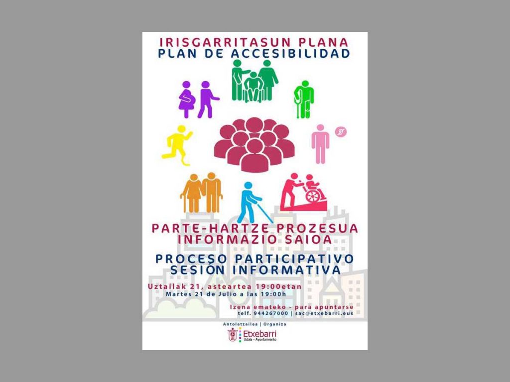 El ayuntamiento de Etxebarri encargó a la empresa Geotech Gestión Espacial la realización de la propuesta del Plan de Accesibilidad para implementar en el muncipio. Tras estos meses de parón debido a la pandemia del virus COVID 19, el ayuntamiento retoma su intención de recoger las aportaciones de las diferentes entidades de la localidad y la ciudadanía en general con respecto este plan. Para ello ha organizado una sesión abierta en la que se expondrán las actuaciones que recoge el plan y a la que se podrán realizar aportaciones. La sesión participativa tendrá lugar el martes día 21 de julio a las 19:00 horas en el Salón de Plenos del Ayuntamiento. El aforo será limitado con lo que se precisa inscripción previa: 94 426 7000 o sac@etxebarri.eus