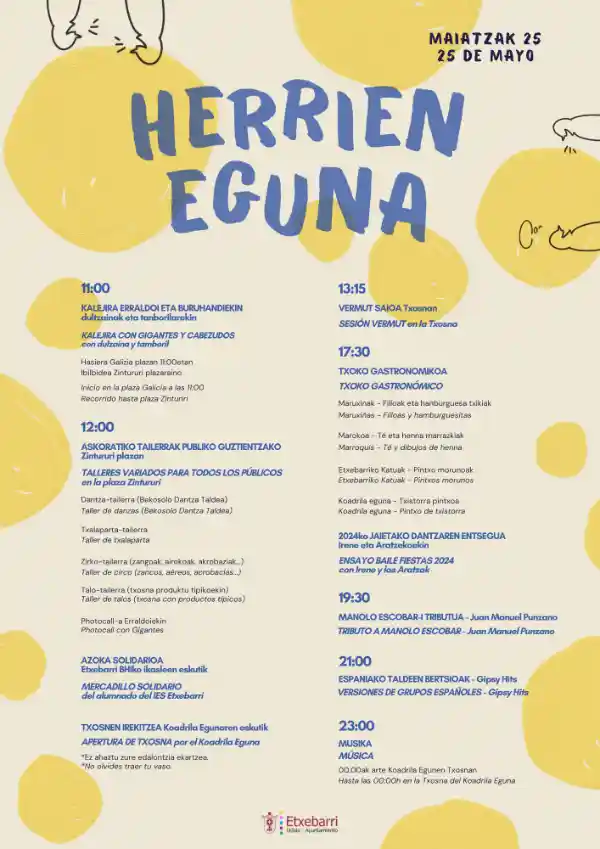 A lo largo de la mañana se podrá participar en talleres de danzas vascas y txalaparta, taller de talo y taller de circo con zancos, aéreos, acrobacias… A las 12 horas el alumnado del IES Etxebarri ha organizado un mercadillo solidario de juguetes, libros, menaje,… Esta actividad está recogida dentro programa Agenda 2030 Escolar, que persigue que la juventud participe en en la sostenibilidad del municipio.