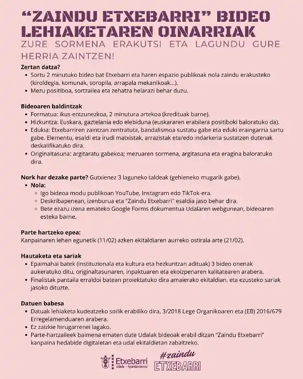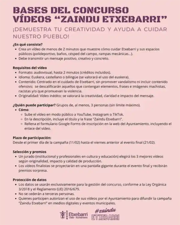 Quienes quieran participar en el concurso de vídeos deberán crear un vídeo audiovisual en euskera, castellano o bilingüe (valorándose el uso del euskera), de, como hemos mencionado hasta dos minutos, orientado a fomentar el cuidado de Etxebarri, evitando cualquier mensaje relacionado con el vandalismo o contenido ofensivo. Se valorará especialmente la creatividad y el impacto del mensaje. Serán descalificados los vídeos que no se alineen con los valores de Igualdad y convivencia que el municipio de Etxebarri fomenta en todas sus actividades.