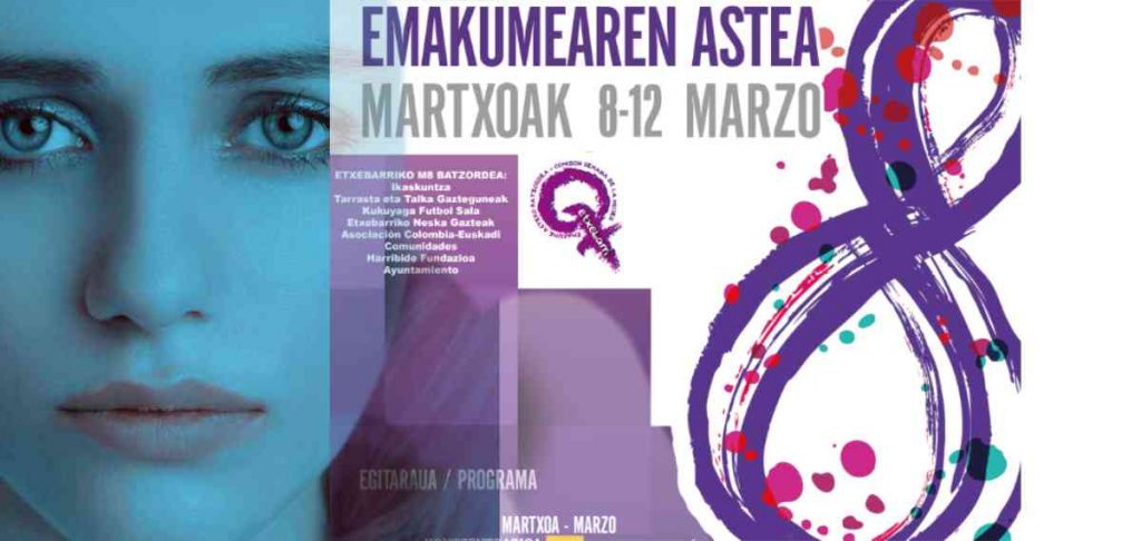 Los actos previstos arrancarán el mismo martes 8 de marzo a la 18:30h. con la concentración en la Plaza del Ayuntamiento y posterior Batukada-Kalejira desde la plaza hasta la Casa de Cultura. Un desfile, una exposición de deporte femenino, documentales, coloquios, se sucederán a los largo de la semana y para finalizar, el sábado 12 tendrán lugar la emisión de radio – “Emakumeen Ahotsa ” y los talleres de confección de compresas ecológicas y “Distintivo 8M” en la Casa de Cultura, desde la seis de la tarde.