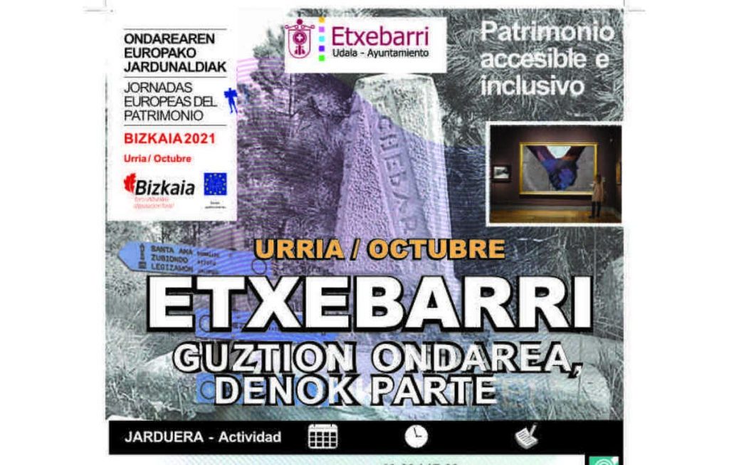 El Ayuntamiento de Etxebarri ha organizado un interesante programa bajo el lema “Guztion ondarea, denok parte, Patrimonio accesible e inclusivo” que se desarrollará del 15 al 24 de octubre con el objetivo de dar a conocer y difundir el patrimonio del municipio. Con esta iniciativa se suma a las Jornadas Europeas del Patrimonio promovidas por la Diputación Foral de Bizkaia.