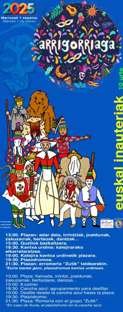 Como es habitual Arrigorriaga celebra sus carnavales por partida doble, ya que el sábado 1 de marzo se celebran en el casco urbano, y el sábado siguiente, día 8, en Abusu. Para esta ocasión la organización de los carnavales del casco han elegido como tema “Euskal Inauteriak”.