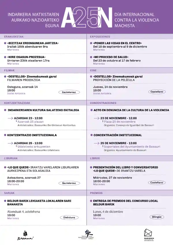 El lunes 25 de noviembre, el Ayuntamiento de Basauri ha convocado una concentración institucional a las 13.00 horas en los soportales del edificio consistorial y el miércoles 27, Irantzu Varela presentará su libro y conversatorio “Lo que quede” de 18:00 a 20:00 h. en Marienea. También en Marienea, el 4 de diciembre a las 19.00 h se entregarán también los premios locales del Concurso Beldur Barik y además, acogerá las exposiciones “Poner las vidas en el centro” (hasta el 9 de diciembre) y “Mi proceso de salud” (hasta el 17 de febrero).