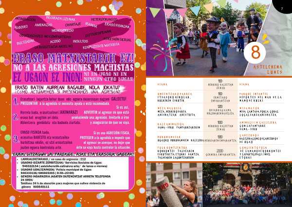 El domingo 7 de septiembre arrancarán las fiestas con la tradicional colocación del pañuelo festivo a los y las recién nacidas, la bajada de cuadrillas con la comparsa Ondalan acompañado por gigantes y cabezudos, el txupinazo y el pregón a cargo de Beny Domínguez, presidenta durante muchos años del