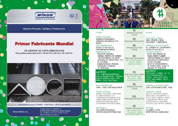 El domingo 14 comenzará por la mañana contará con un taller de circo, animación callejera con Kokotean Kolpe y herri kirolak, en clave mixta. Para el domingo también una novedad, Gaztefest, con divertidas actividades para jóvenes de 12 a 16 años. Posteriormente toro de fuego y para rematar la jornada con la representación teatral de la obra Eros por parte de la compañía IXO.