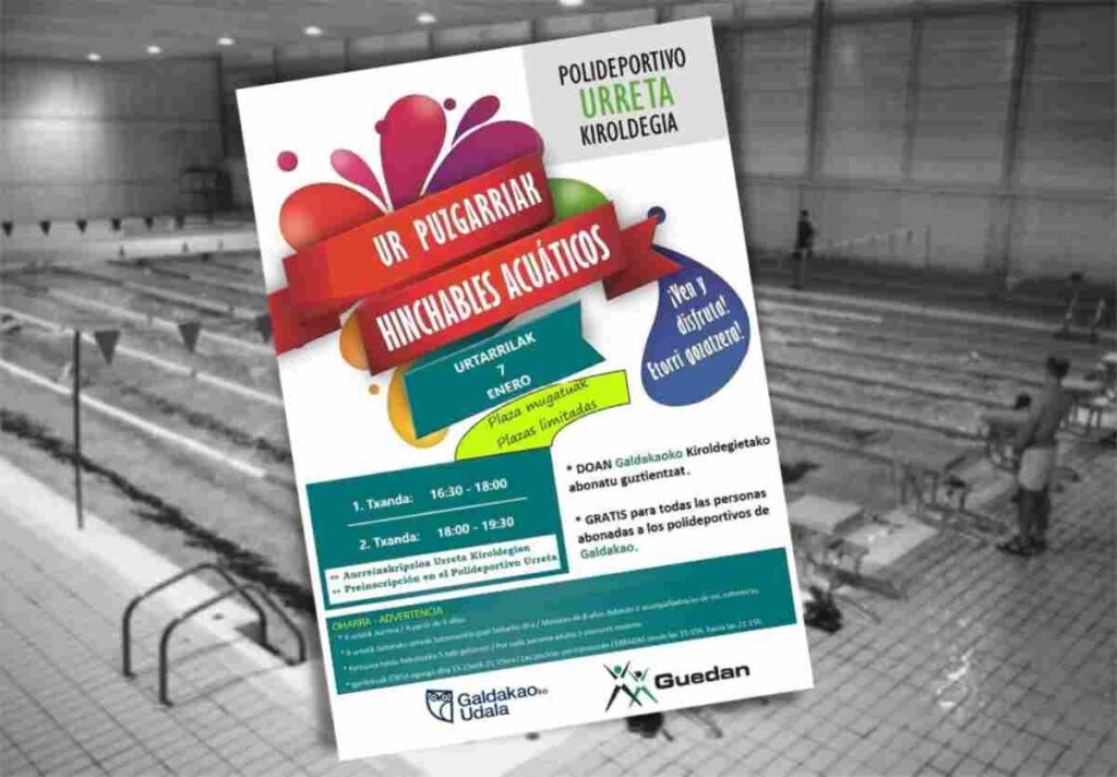 El polideportivo de Urreta instalará hinchables de agua para niños y niñas de entre 4 y 16 años el próximo sábado por la tarde. La actividad se desarrollará en dos turnos: de 16:30 a 18:00 horas y de 18:00 a 19:30 horas. Los y las menores de 8 años deberán ir acompañados por una persona adulta y podrán utilizar manguitos. Cada persona adulta podrá ir con un máximo de 5 menores.