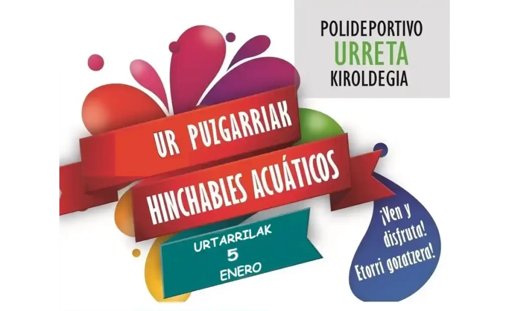 La piscina grande del polideportivo de Urreta acogerá hinchables acuáticos para que las y las txikis puedan finalizar las vacaciones de navidad con una sonrisa. Esta instalación se podrá utilizar en dos turnos: de 10:45 a 12:00 y de 12:15 a 13:30 y está dirigida a niños y niñas mayores de cuatro años. Las y los menores de 12 años deberán ir acompañados de una persona adulta, mientras que los y las menores de 8 años deberán estar acompañados en el agua de una persona adulta. Cada una de ellas podrá tener a su cargo 5 niños y niñas.