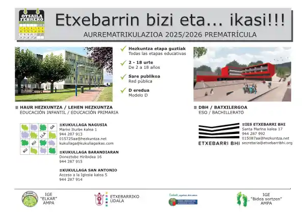Arrancan los primeros pasos del curso 2025-2026 para los centros públicos de enseñanza obligatoria de Etxebarri, IES Etxebarri y CEIP Kukullaga, con la recepción de prematrículas para este próximo curso escolar. El plazo se extenderá desde el lunes 3 de febrero al viernes 14 del mismo mes.