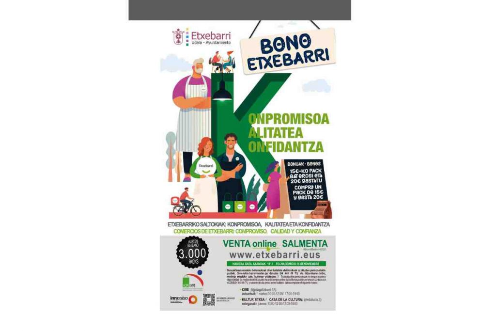 La campaña BONO ETXEBARRI 2021 lleva como lema “Comercios De Etxebarri: Compromiso, calidad y confianza” y alcanzará por primera vez los 3.000 packs de dos bonos de 20€ cada uno, con un coste para la persona consumidora de 15 euros (los otros 5€, los aportará el Ayuntamiento, consiguiendo un 25% de descuento en la compra). De esta manera se asegura una inversión de 60.000 €, de los que el Ayuntamiento aporta 15.000 €, que recaerá en los establecimientos adheridos a la campaña del municipio.