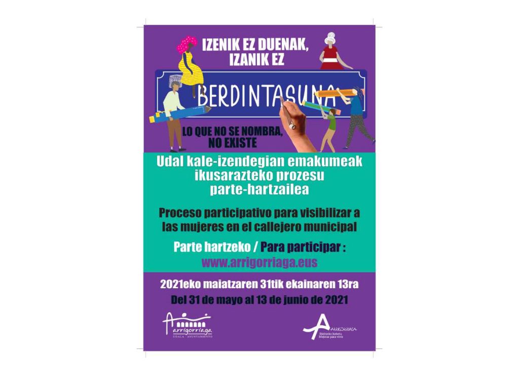 Con el objetivo de acabar con la abrumadora mayoría de nombres propios masculinos de las calles de Arrigorriaga (de 24 calles con nombres propios, únicamente dos son de mujeres: Concha Espina y Santa Isabel) el Ayuntamiento ha impulsado un proceso participativo para que la ciudadanía proponga nombres de mujeres con el fin de elaborar un listado para el cambio del callejero del municipio. Este cambio, ya anuncian desde el consistorio, se hará de forma paulatina.