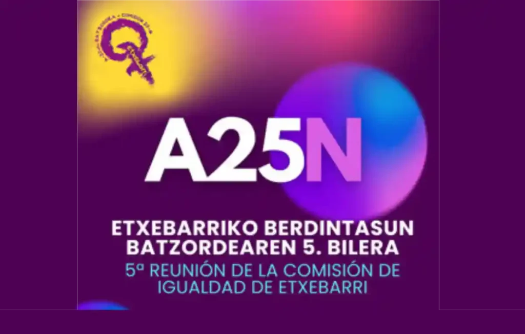 Esta tarde se va a producir la quinta reunión de la Comisión de Igualdad de Etxebarri de cara a celebrar el 25 de noviembre, Día Internacional de la Eliminación de la Violencia contra las Mujeres.