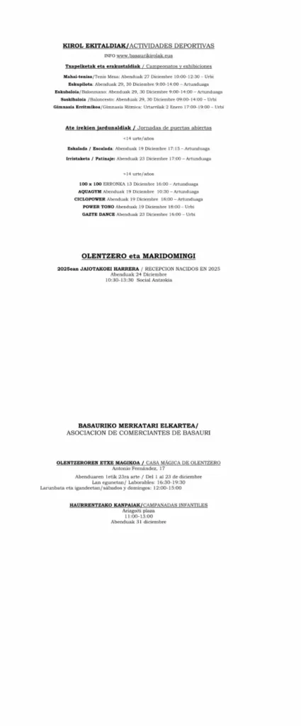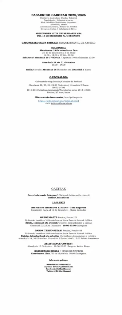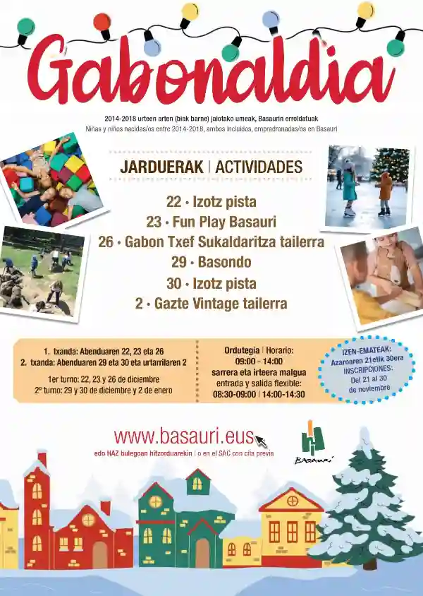 El programa para navidad que ha organizado el Ayuntamiento de Basauri arrancará el día 19 de diciembre y se extenderá hasta el 5 de enero y en él, además de las actividades habituales como el Parque Infantil de Navidad, Olentzero o la Cabalgata de Reyes, se desarrollará un ampliado y variado programa de actividades para todas las edades, Gabonaldia.