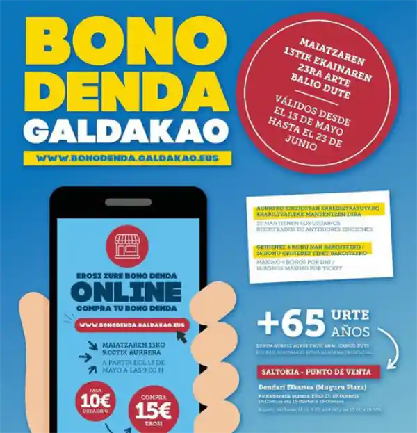 Este lunes 13 de mayo a las 9 de la mañana arranca una nueva campaña del Bono Denda Galdakao. Una vez más el ayuntamiento impulsa las ventas en los establecimientos locales con esta iniciativa que permite comprar bonos de 10€ que luego tendrán un valor de 15€ la hora de realizar la compra por parte de la persona consumidora. Los 5€ de diferencia los aportará el consistorio.