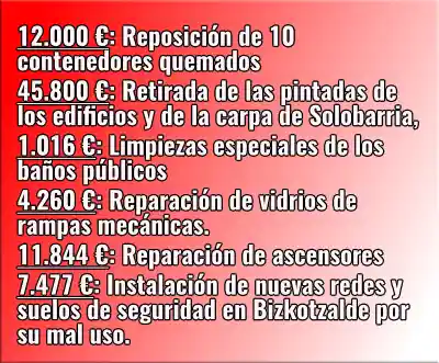 Reparación de ascensores, retirada de pintadas, rotura de la carpa de Solobarria, contenedores quemados, sustitución de vidrios rotos de las rampas mecánicas, desperfectos en baños públicos,…La lista es larga y los gastos muchos, pero como hemos mencionado antes, el peor efecto es hacia las personas, “por ejemplo, que alguien provoque intencionadamente que los