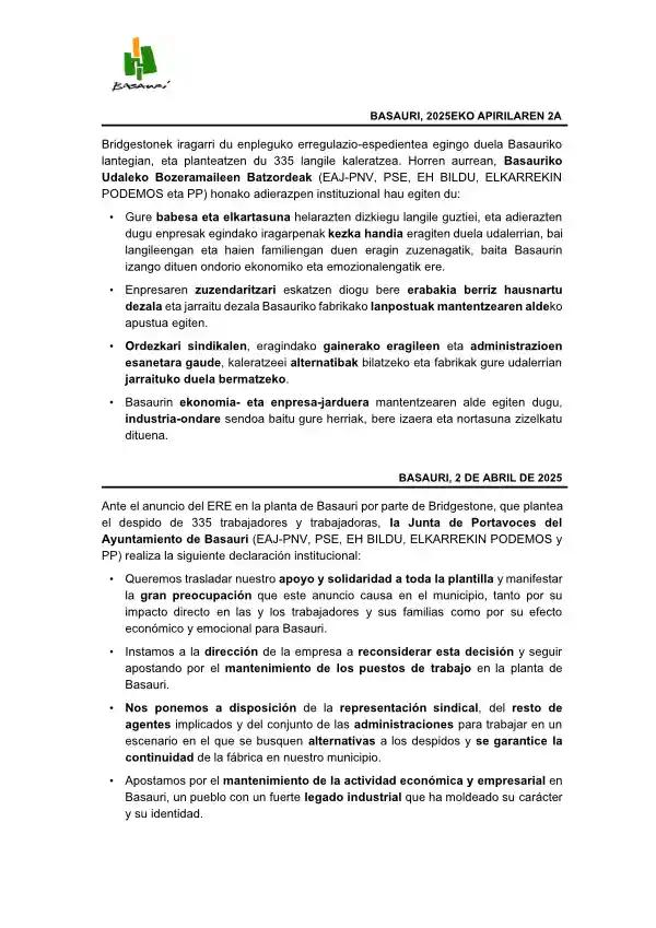 La Junta de Portavoces del Ayuntamiento de Basauri, formada por todos los grupos políticos con representación municipal (EAJ-PNV, PSE, EH BILDU, ELKARREKIN PODEMOS y PP), han firmado una declaración institucional en la que muestran su apoyo y solidaridad con la plantilla de Bridgestone Hispania Manufacturing, antigua Firestone, ante el anuncio de la empresa de un ERE en la planta de Basauri que plantea el despido de 335 trabajadores y trabajadoras.