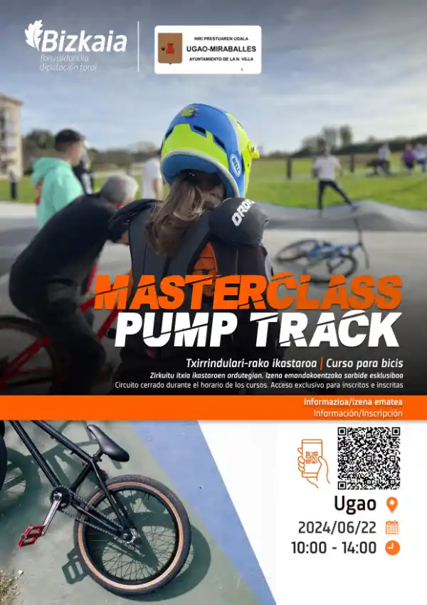 Las personas aficionadas a la práctica del Pump Track podrán participar en las masterclass que la Diputación Foral de Bizkaia, en colaboración con el Ayuntamiento de Ugao-Miraballes, impartirá el sábado 22 de junio en el circuito situado junto al cementerio.