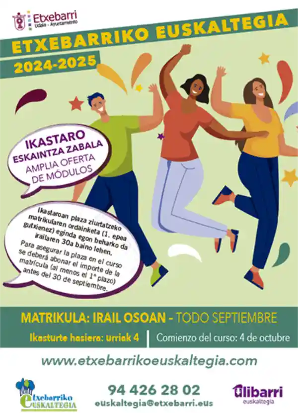 El euskaltegi de Etxebarri ha abierto durante este mes de septiembre el plazo para matricularse en sus cursos presenciales y de autoaprendizaje adaptados a las necesidades de la ciudadanía en horarios y módulos amplios, dirigidos a personas mayoresde 16 (o que los cumplan a lo largo del año). La matrícula se realizará presencialmente en el Euskaltegi de Etxebarri, en el Chalet Amarillo del Parque Bekosolo.