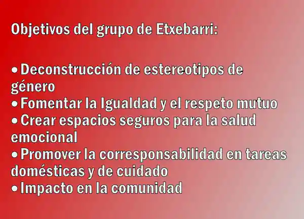 Este “espacio seguro” fue solicitado por el colectivo para servircomo lugar en el que expresarse en libertad, compartir experiencias y participar en formaciones y actividades que les permitan cuestionar los modelos tradicionales de masculinidad. La propuesta responde a una necesidad sentida por muchos varones de Etxebarri de tener un tiempo y un lugar para el autoconocimiento, el debate y la formación, en un contexto donde las dinámicas sociales están cambiando rápidamente.