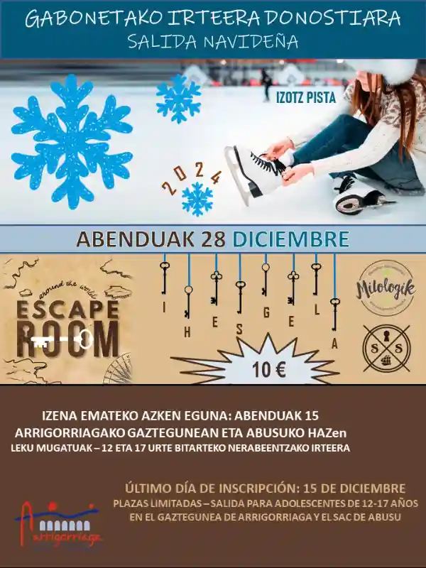 El precio de la salida es de 10 euros y la inscripción se podrá realizar en el Gaztegune y en el SAC de Abusu hasta el 15 de diciembre. Podrán participar personas jóvenes de entre 12 y 17 años empadronadas en Arrigorriaga. Hay 20 plazas y, en caso de el número de solicitudes supere el número de plazas ofertadas, se realizará un sorteo en el Gaztegunea.