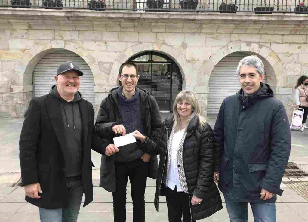 Gorka Menéndez, miembro de la Elkarlaguntza Sarea, ha recibido el cheque del dinero recaudado de manos del secretario de la Peña Santa Cruz, Xabier Bikandi, y del coordinador, Alfonso Requero, en el Ayuntamiento. Junto a ellos ha participado la concejala de Acción Social, Mari Paz Losada.