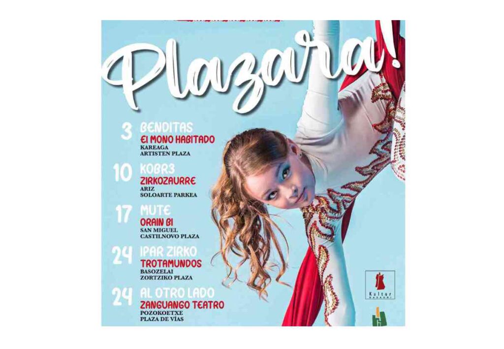 Basauri celebrará por segundo año, Plazara!, una iniciativa que complementa la oferta teatral de interior del Social Antzokia con representaciones teatrales a pie de calle. Este festival de teatro de calle contará exclusivamente con grupos vascos y tendrá lugar junto a las Casas de Cultura del municipio (Kareaga, Ariz, San Miguel, Basozelai y Pozokoetxe) todos los sábados de junio a las 13:00 horas.