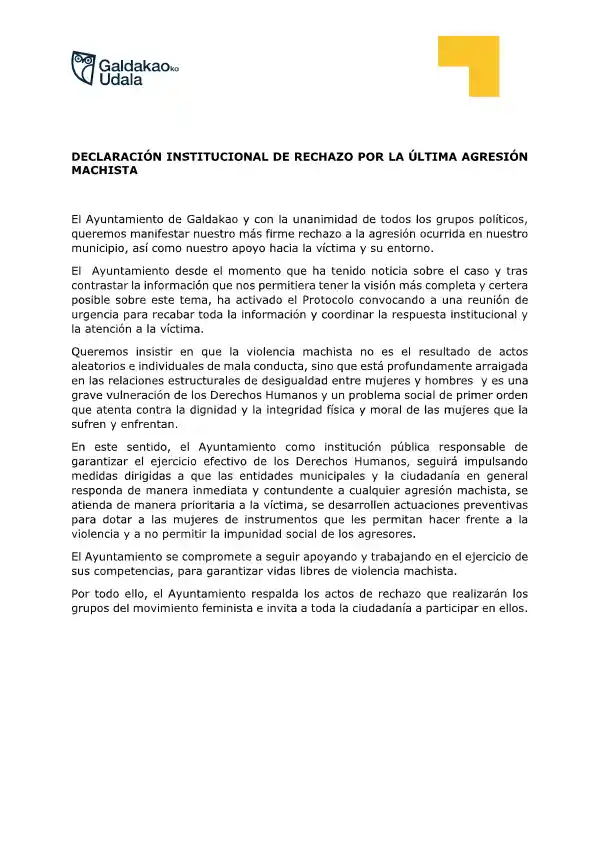Hoy por la mañana, el Equipo de Gobierno de Galdakao ha emitido una declaración institucional, similar a casos anteriores, en la que se condenaba la agresión machista ocurrida en el municipio durante el fin de semana y ofrecía apoyo hacia la víctima y su entorno.