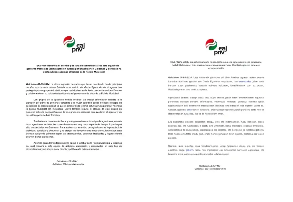 Esta tarde EAJ-PNV de Galdakao ha emitido, a su vez, una nota en la que denuncia “el silencio y la falta de contundencia de este equipo de gobierno frente a la última agresión sufrida por una mujer en Galdakao y donde se ha obstaculizado además el trabajo de la Policía Municipal”