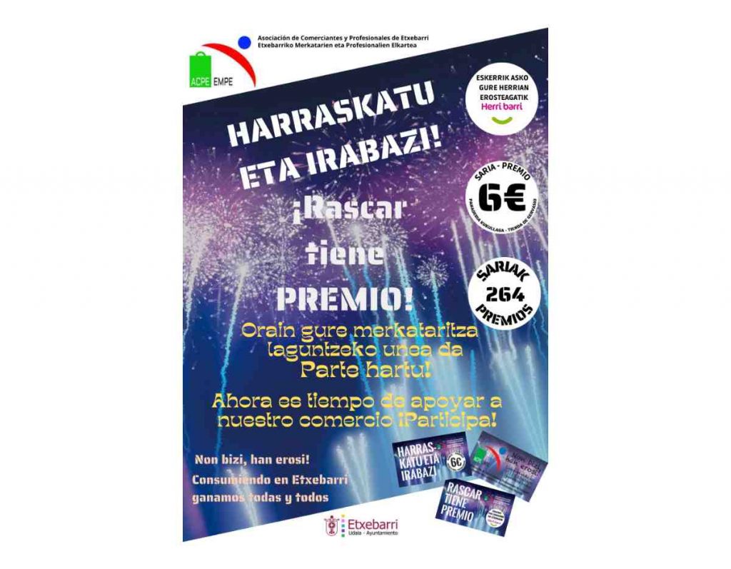 «Impulsar el comercio de proximidad y fomentar el aumento de clientes potenciales» son los objetivos de la campaña “Rasca y Gana” que pone en marcha desde hoy la Asociación de Comerciantes y Profesionales de Etxebarri (ACPE) con la colaboración del Ayuntamiento de Etxebarri.