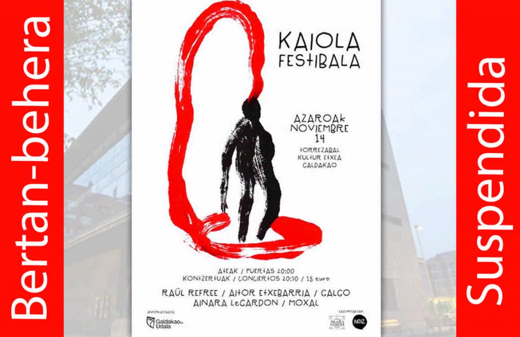 A pesar de haber realizado varias adaptaciones en los últimos meses para adecuarse a las circunstancias del momento, tanto en aforo como en medidas de seguridad sanitaria, la edición de este año del festival de música experimental » Kaiola«, que debía celebrarse el 14 de noviembre en Torrezabal Kultur Etxea de Galdakao, se ha suspendido debido a las últimas restricciones dictaminadas por el Gobierno Vasco para hacer frente al Covid-19.