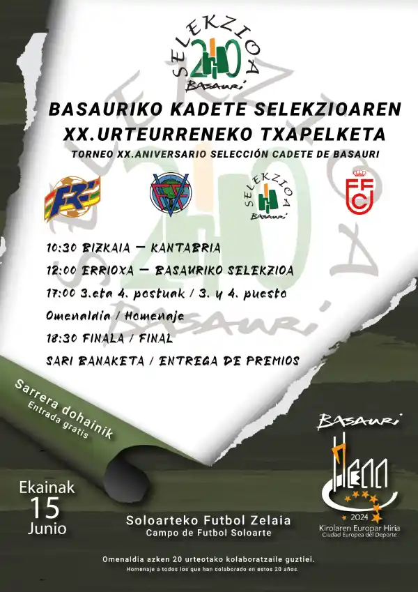 Con entrada libre, el torneo comenzará a las 10:30 horas y en él se medirán las selecciones de Basauri, Bizkaia, Cantabria y La Rioja. Antes de disputarse la final se realizará un pasillo a todos los integrantes de la selección de Basauri de estos 20 años. La final se jugará a las 18.30 h y después tendrá lugar la entrega de premios.