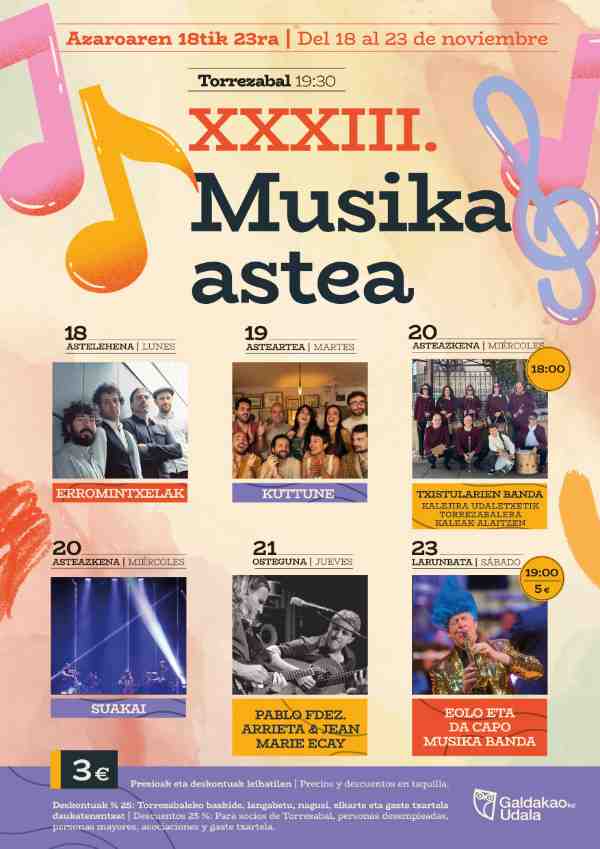 La XXXIII edición de Musika Astea de Galdakao vuelve a traer ritmos de lo más variado al municipio. En Torrazabal Kultur Etxea podremos disfrutar de la actuciones de grupos con estilos muy variados como swing, folk, jazz… Y para animar las calles, tres pasacalles de las y los estudiantes de la escuela y de la banda de txistularis.