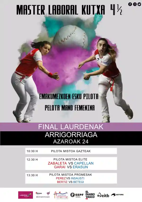 Este domingo se jugarán los cuartos de final del Master Laboral Kutxa del Cuatro y Medio en el frontón de Arrigorriaga. En este campeonato de pelota mano individual han participado 70 pelotaris femeninas y los partidos comenzarán a partir de las 10:30.