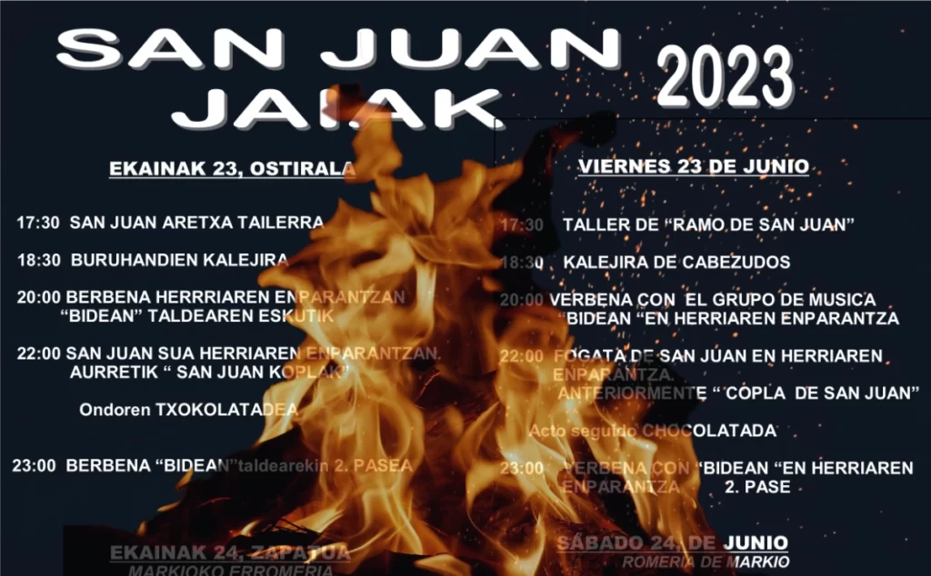 Como no podía ser de otra manera, el acto central será la tradicional fogata de San Juan(22:00h) y acto seguido se disfrutará de una chocolatada, pero habrá sido a las 17:30 cuando hayan arrancado las fiestas con un taller de ramos de San Juan y una kalejira de cabezudos. La música tendrá su lugar en Herriaren Enparantza de la mano del grupo de música “Bidean” (20:00h), que ofrecerán un segundo pase a las 23:00.